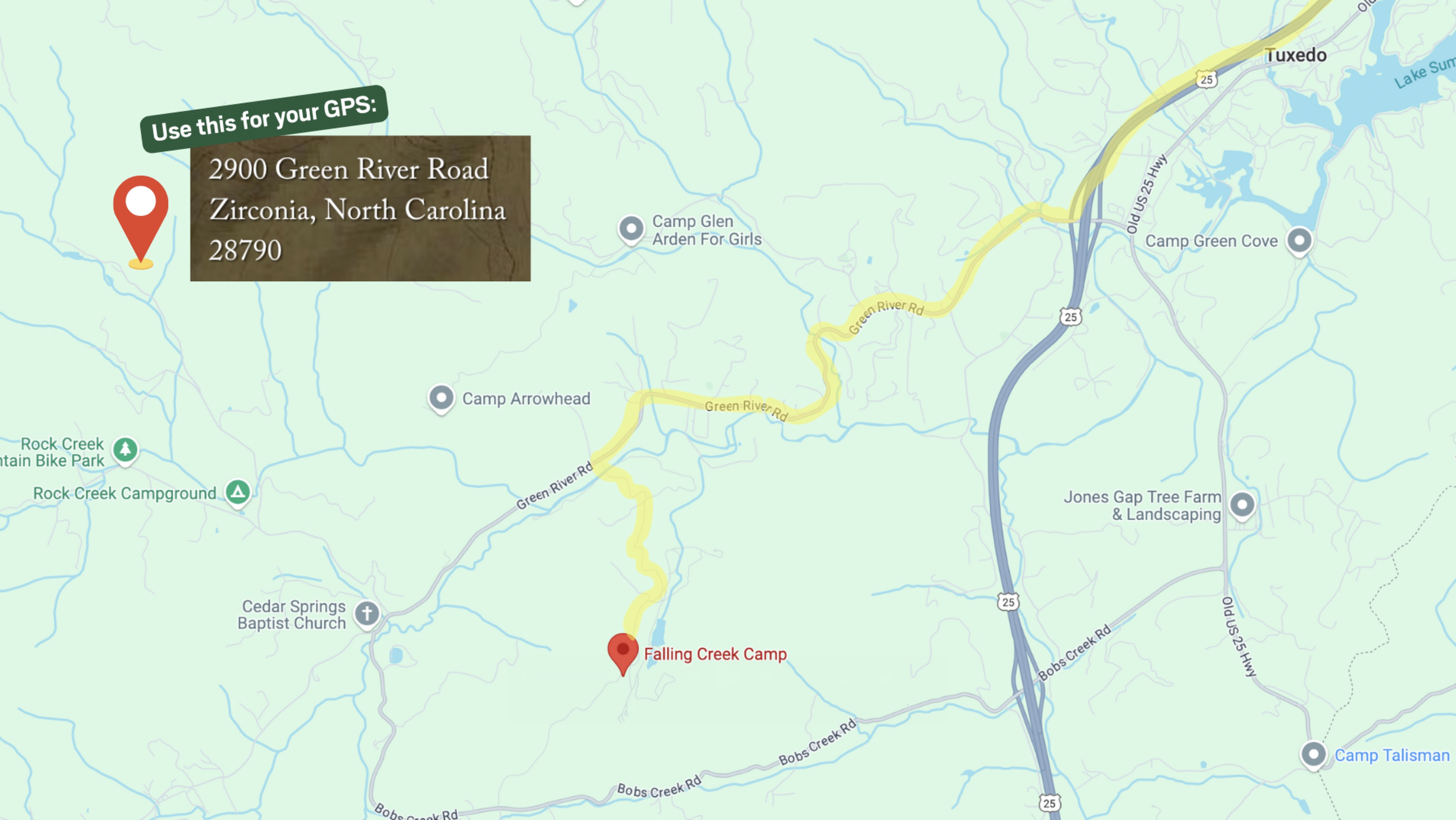 Falling Creek Camp is located in Tuxedo, North Carolina. When you drive in on Highway 25, you’ll take Exit 3, for Green River road. You can use the Google Maps link to get driving directions from anywhere to Falling Creek Camp. You can also use the step by step driving directions from nearby major cities listed on our main site here.