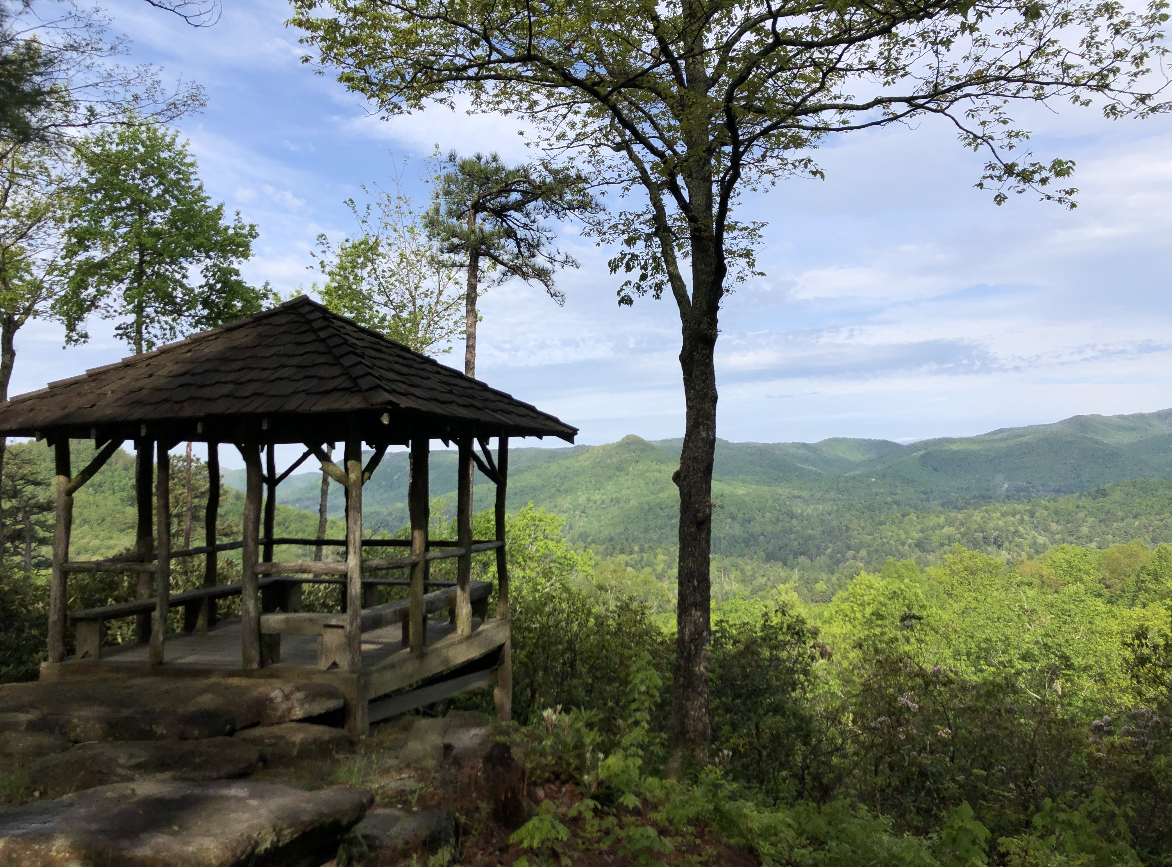 You’ll pass the barn on your right. Next you’ll pass Moab, the mountain bike hut. Soon after will be the overlook, a beautiful view of the surrounding Blue Ridge Mountains and the Green River valley off to your right.